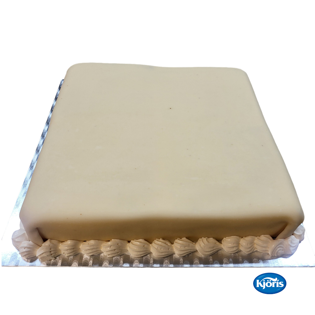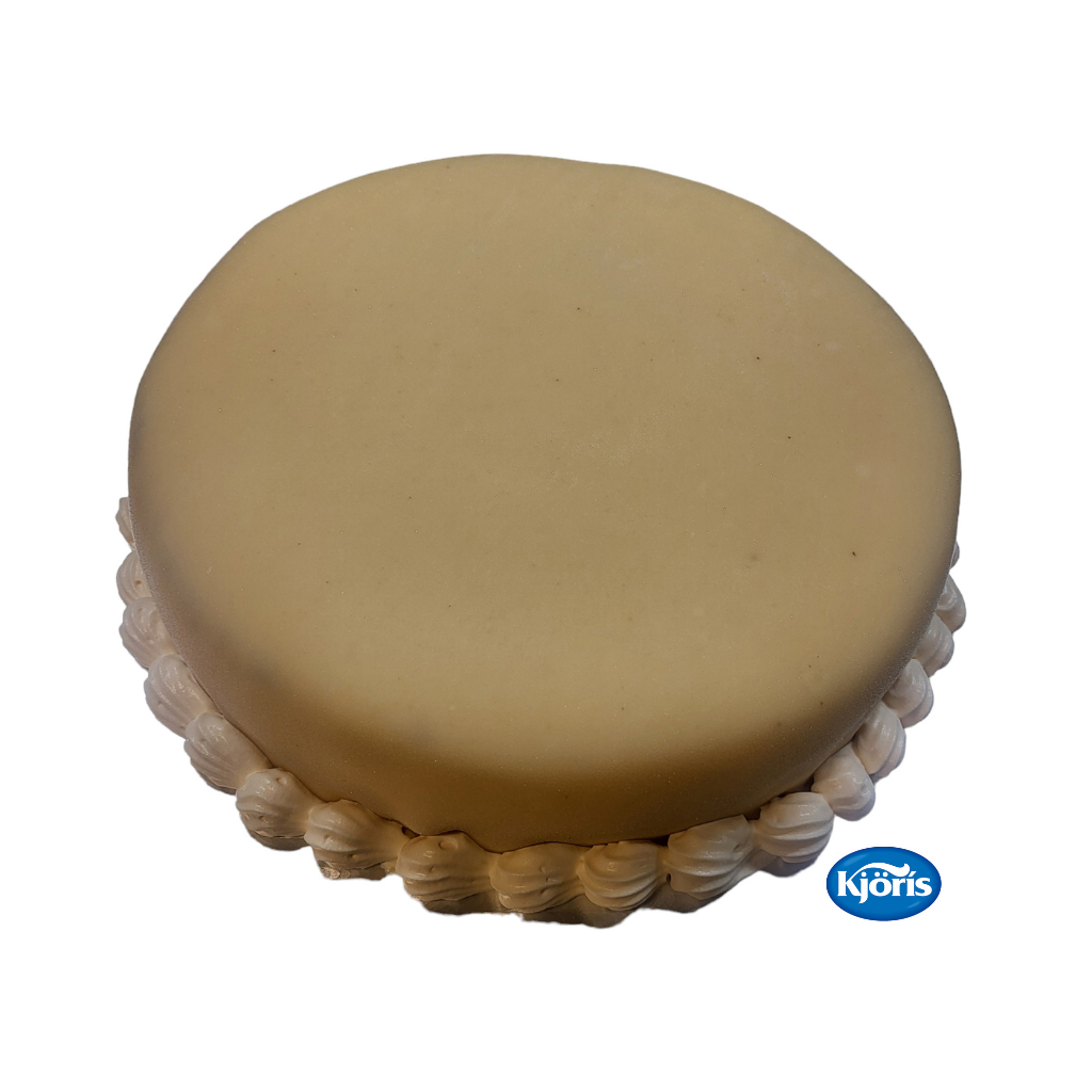 Konfektís hjúpað marsipani, tertan kemur óskreytt en með þeytikremi / mokkakremi neðst á tertunni.